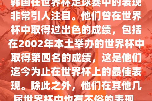 韩国在世界杯足球赛中的表现非常引人注目。他们曾在世界杯中取得过出色的成绩,包括在2002年本土举办的世界杯中取得第四名的成绩,这是他们迄今为止在世界杯上的最佳表现。除此之外,他们在其他几届世界杯中也有不俗的表现。