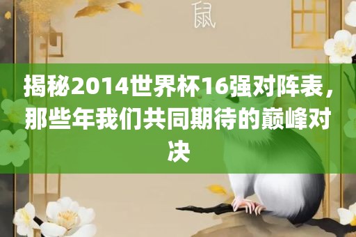 摘要:本文将为你揭秘2014年世界杯足球赛的16强对阵表,带你回顾那些年我们共同期待的巅峰对决。文章将详细介绍各组球队之间的激烈比拼,以及那些令人热血沸腾的瞬间。重温那些经典战役,让我们再次感受足球的魅力。