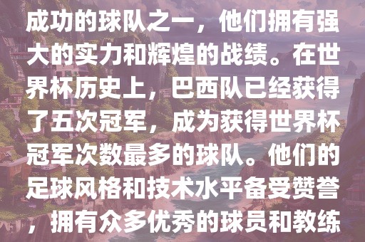 巴西足球队是世界杯历史上最成功的球队之一,拥有强大的实力和辉煌的战绩。他们获得了五次世界杯冠军,是获得冠军次数最多的球队。其足球风格和技术水平备受赞誉,拥有众多杰出的球员和教练。