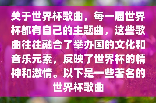 关于世界杯歌曲,每一届世界杯都有自己的主题曲,这些歌曲往往融合了举办国的文化和音乐元素,反映了世界杯的精神和激情。以下是一些著名的世界杯歌曲