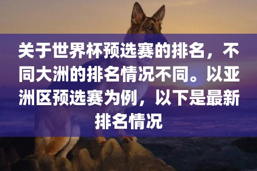 摘要:关于世界杯预选赛排名,各大洲情况各异。以亚洲区为例,最新的排名情况如下。随着比赛的进行,排名可能发生变化,请关注最新动态。