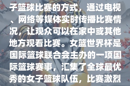 直播女篮世界杯是一种观看女子篮球比赛的方式,通过电视、网络等媒体实时传播比赛情况,让观众可以在家中或其他地方观看比赛。女篮世界杯是国际篮球联合会主办的一项国际篮球赛事,汇集了全球最优秀的女子篮球队伍,比赛激烈、精彩纷呈。