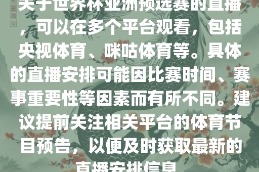 信息仅供参考,建议访问相关论坛或咨询专业人士,获取更多关于世界杯亚洲预选赛直播的信息。