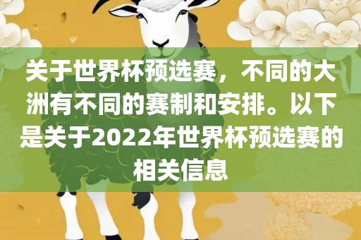 关于世界杯预选赛,不同的大洲有不同的赛制和安排。以下是关于2022年世界杯预选赛的相关信息