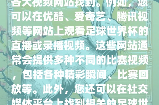 可以在各大视频网站观看足球世界杯的直播或录播视频,如优酷、爱奇艺、腾讯视频等。这些网站提供多种比赛视频,包括精彩瞬间和比赛回放等。社交媒体平台上也有相关视频分享。摘要字数控制在100-200字左右。