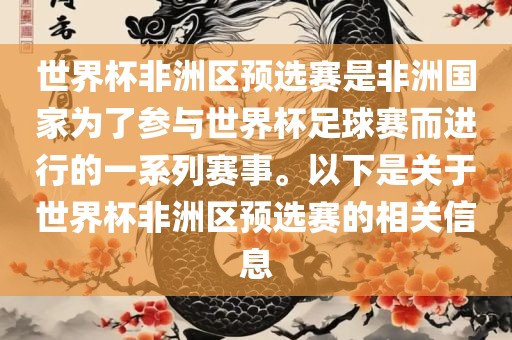 世界杯非洲区预选赛是非洲国家为了参与世界杯足球赛而展开的重要赛事,各队之间的竞争非常激烈,具体的比赛安排、参与队伍和规则流程可能会根据当年的FIFA规定而有所变化,建议关注相关赛事的官方信息以获取最新动态。
