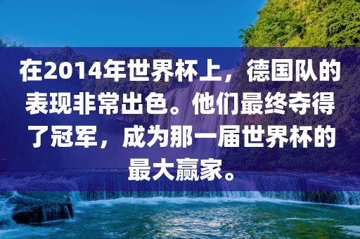 在2014年世界杯上,德国队的表现非常出色。他们最终夺得了冠军,成为那一届世界杯的最大赢家。