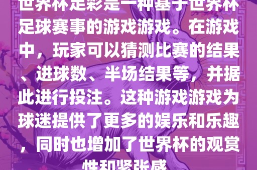 世界杯足彩是一种基于世界杯足球赛事的游戏游戏。在游戏中,玩家可以猜测比赛的结果、进球数、半场结果等,并据此进行投注。这种游戏游戏为球迷提供了更多的娱乐和乐趣,同时也增加了世界杯的观赏性和紧张感。
