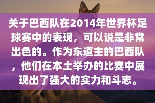 关于巴西队在2014年世界杯足球赛中的表现,可以说是非常出色的。作为东道主的巴西队,他们在本土举办的比赛中展现出了强大的实力和斗志。
