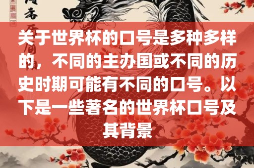 除此之外,每一届世界杯也都有自己的独特口号,旨在表达主办国对足球的热情和对世界杯的期待,这些口号不仅代表了世界杯的精神和文化内涵,也成为了世界杯历史的重要组成部分,如果您对某一届世界杯的口号有更具体的问题,欢迎继续向我提问。