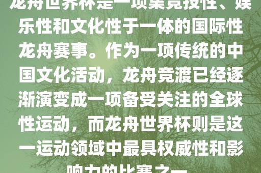 龙舟世界杯是一项集竞技性、娱乐性和文化性于一体的国际性龙舟赛事。作为一项传统的中国文化活动,龙舟竞渡已经逐渐演变成一项备受关注的全球性运动,而龙舟世界杯则是这一运动领域中最具权威性和影响力的比赛之一。