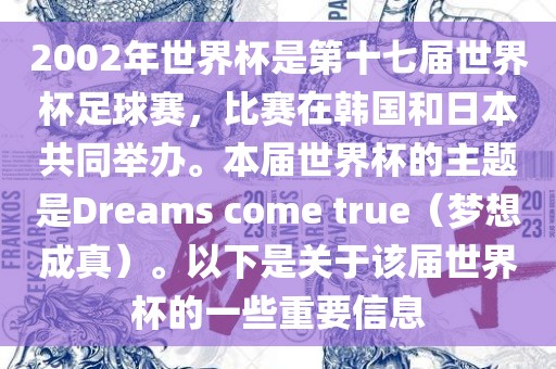 2002年世界杯是第十七届世界杯足球赛,比赛在韩国和日本共同举办。本届世界杯的主题是Dreams come true(梦想成真)。以下是关于该届世界杯的一些重要信息