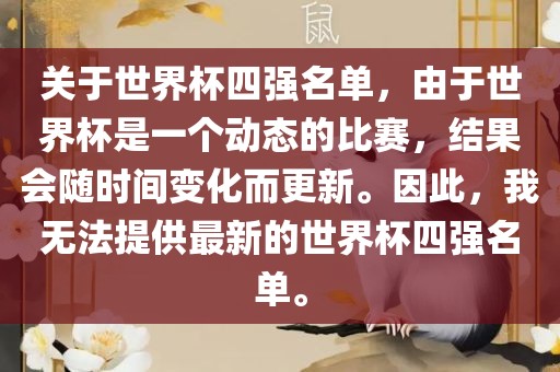 关于世界杯四强名单,由于世界杯是一个动态的比赛,结果会随时间变化而更新。因此,我无法提供最新的世界杯四强名单。