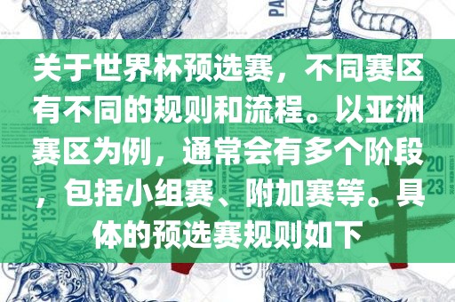 关于世界杯预选赛,不同赛区有不同的规则和流程。以亚洲赛区为例,通常会有多个阶段,包括小组赛、附加赛等。具体的预选赛规则如下