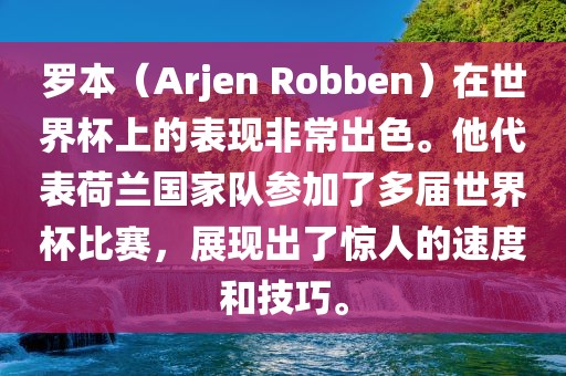 罗本在世界杯上的最佳表现之一是在2010年南非世界杯上,他作为荷兰国家队的核心球员之一,帮助球队在比赛中取得了出色的成绩,在那届比赛中,罗本以其惊人的速度和突破能力成为了球队进攻端的重要武器,并在多场比赛中为球队创造了很多进球机会。