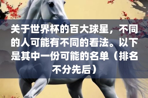 • 转载请注明来自金炬实业股份有限公司,本文标题:《关于世界杯的百大球星,不同的人可能有不同的看法。以下是其中一份可能的名单(排名不分先后)》