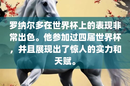 罗纳尔多在世界杯上的表现令人瞩目。他参加过四届世界杯,展现出了惊人的实力和天赋。他的出色表现使他成为足球界的一位传奇人物。他的球技和速度使他成为比赛中的关键人物,赢得了球迷和评论家的赞誉。他的表现令人难以忘怀,成为世界杯历史上的一个重要组成部分。