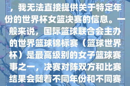 如果您想了解最近一次或特定年份的世界篮球锦标赛女子决赛的情况,建议您访问相关的体育新闻网站、社交媒体平台或篮球协会官方网站,以获取最准确和最新的信息,这些资源通常会提供比赛的实时更新、历史数据和新闻报道。