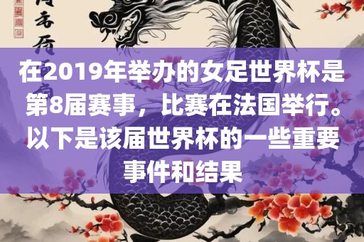 在2019年举办的女足世界杯是第8届赛事,比赛在法国举行。以下是该届世界杯的一些重要事件和结果