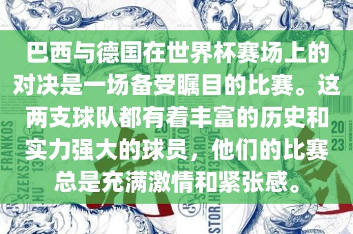 巴西与德国在世界杯赛场上的对决总是充满悬念和看点,两支球队都有着丰富的历史、强大的实力和优秀的球员,他们的比赛总是能够吸引全球的关注。