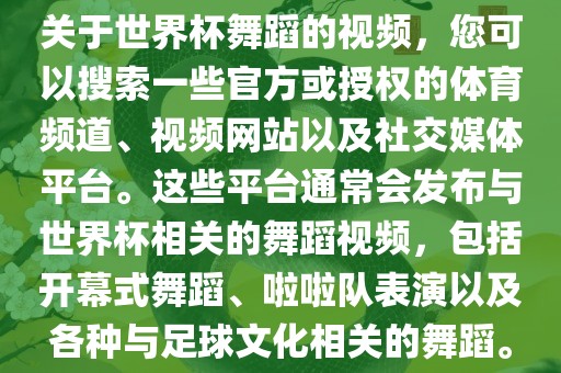 您可以在YouTube、抖音、快手等视频网站上搜索关键词如“世界杯舞蹈视频”、“世界杯开幕式舞蹈”等,以找到相关的视频,一些官方体育频道如CCTV-5等也可能会直播或回放世界杯相关舞蹈表演。