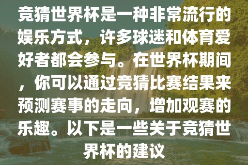 竞猜世界杯是一种非常流行的娱乐方式,许多球迷和体育爱好者都会参与。在世界杯期间,你可以通过竞猜比赛结果来预测赛事的走向,增加观赛的乐趣。以下是一些关于竞猜世界杯的建议