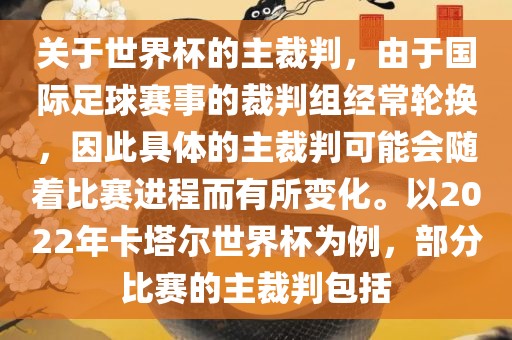 关于世界杯的主裁判,由于国际足球赛事的裁判组经常轮换,因此具体的主裁判可能会随着比赛进程而有所变化。以2022年卡塔尔世界杯为例,部分比赛的主裁判包括