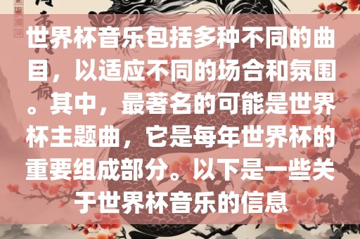 世界杯音乐包含多种曲目,适应不同场合和氛围。世界杯主题曲最为著名,是每年世界杯不可或缺的部分。这些音乐以激情、活力和庆祝为主题,为世界杯增添氛围和乐趣。摘要字数在100-200字之间。