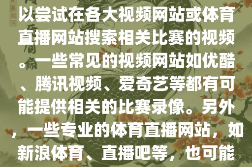 摘要:要观看女足世界杯的比赛录像,可以在优酷、腾讯视频、爱奇艺等常见视频网站或新浪体育、直播吧等专业体育直播网站上搜索相关比赛视频。这些平台提供了丰富的足球比赛资源,包括女足世界杯的录像。