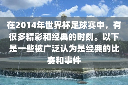 在2014年世界杯足球赛中,有很多精彩和经典的时刻。以下是一些被广泛认为是经典的比赛和事件