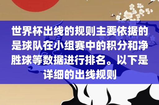 世界杯出线的规则主要依据的是球队在小组赛中的积分和净胜球等数据进行排名。以下是详细的出线规则