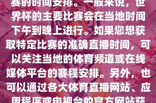 世界杯直播时间因地区时区及比赛安排而异,主要比赛通常在当地时间下午至晚上进行。要获取特定比赛的准确直播时间,可关注当地体育频道或在线媒体平台赛程安排。可通过体育直播网站、应用程序或电视台官网获取实时直播时间和频道信息。摘要字数控制在100-200字以内。