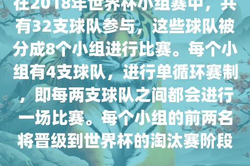 在2018年世界杯小组赛中,共有32支球队参与,这些球队被分成8个小组进行比赛。每个小组有4支球队,进行单循环赛制,即每两支球队之间都会进行一场比赛。每个小组的前两名将晋级到世界杯的淘汰赛阶段。