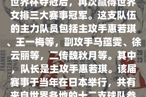 在2011年日本女排世界杯赛中,中国女排以全胜战绩摘得冠军,这也是中国女排继1995年世界杯夺冠后,再次赢得世界女排三大赛事冠军。这支队伍的主力队员包括主攻手惠若琪、王一梅等,副攻手马蕴雯、徐云丽等,二传魏秋月等。其中,队长是主攻手惠若琪。该届赛事于当年在日本举行,共有来自世界各地的十二支球队参与角逐。此外,该届世界杯的最佳发球奖由日本名将木村纱织获得。