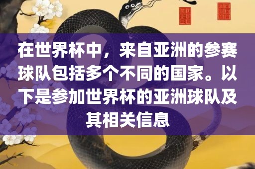 在世界杯中,来自亚洲的参赛球队包括多个不同的国家。以下是参加世界杯的亚洲球队及其相关信息