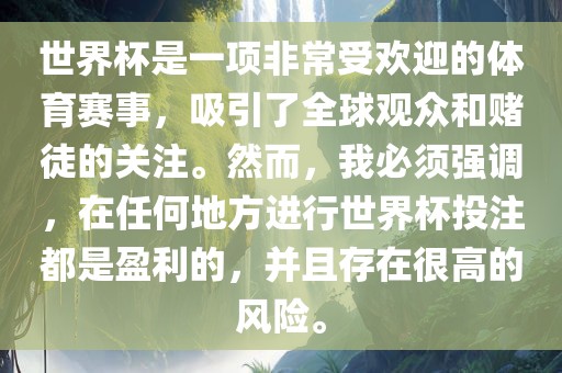 世界杯是一项非常受欢迎的体育赛事,吸引了全球观众和赌徒的关注。然而,我必须强调,在任何地方进行世界杯投注都是盈利的,并且存在很高的风险。