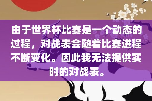 由于世界杯比赛是一个动态的过程,对战表会随着比赛进程不断变化。因此我无法提供实时的对战表。