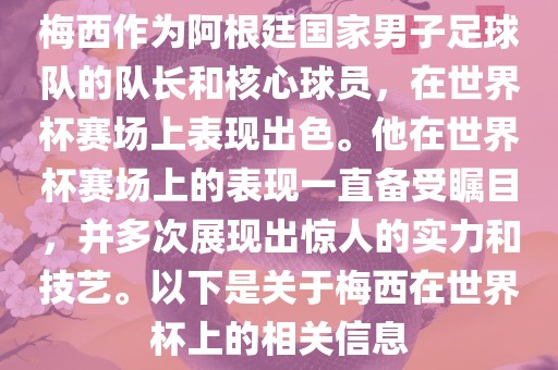 梅西作为阿根廷国家男子足球队的队长和核心球员,在世界杯赛场上表现出色。他在世界杯赛场上的表现一直备受瞩目,并多次展现出惊人的实力和技艺。以下是关于梅西在世界杯上的相关信息